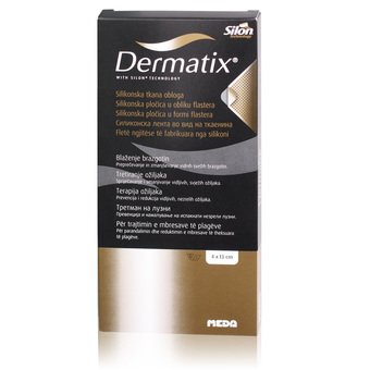 Dermatix silikonski obliž s tkanino predstavlja izvirno kombinacijo prožnosti in oprijema. Silikon zmanjšuje hipertrofne brazgotine in keloide, zgornja plast pa ponuja občutek udobja ter ne moti, ko ga imamo nameščenega na predelih, pokritih z obleko.